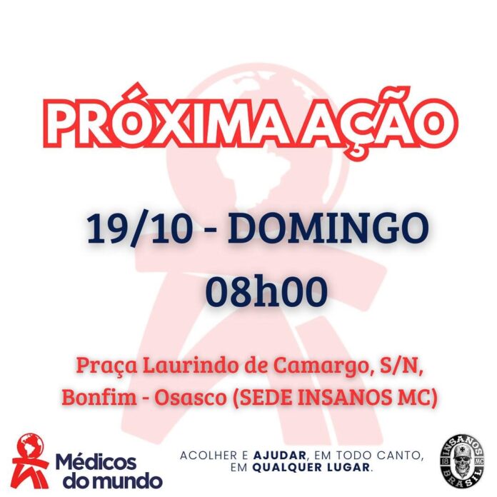 No próximo domingo, 19 de outubro, a partir das 8h, a organização Médicos do Mundo realiza mais uma importante ação social na Praça Laurindo de Camargo, no Bonfim (Sede dos Insanos MC), em Osasco.