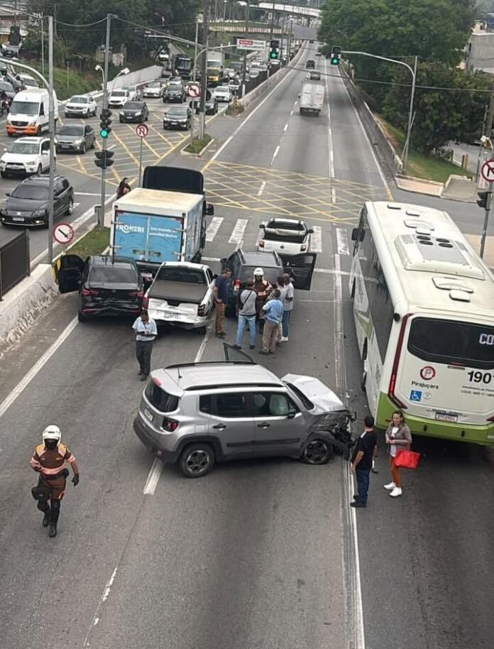A batida envolveu automóveis de passeio e um ônibus, o que intensificou o congestionamento em uma das principais vias de ligação entre Taboão da Serra e Embu das Artes.