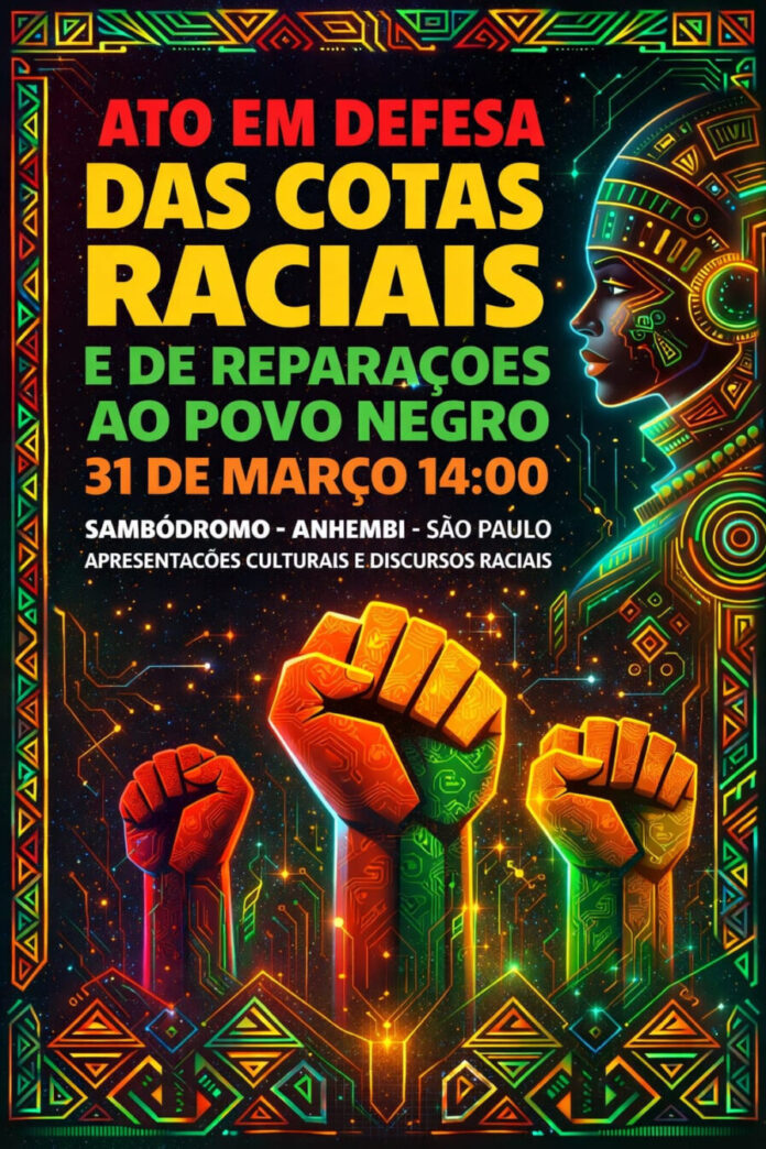 Marcado para o dia 31 de março, às 14h, no Sambódromo do Anhembi, em São Paulo, o ato em defesa das cotas raciais e das políticas de reparação ao povo negro promete reunir movimentos sociais, lideranças políticas, artistas e ativistas em uma manifestação que une cultura, política e identidade.