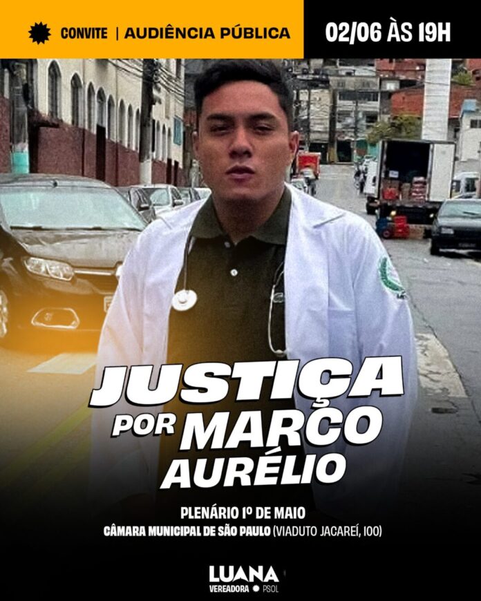 A Câmara Municipal de São Paulo sediará, no próximo dia 02 de junho, uma audiência pública para cobrar justiça por Marco Aurélio, jovem profissional da saúde cuja morte gerou grande comoção e protestos na capital. O evento acontecerá às 19h no Plenário 1º de Maio, com organização da vereadora Luana Alves (PSOL).