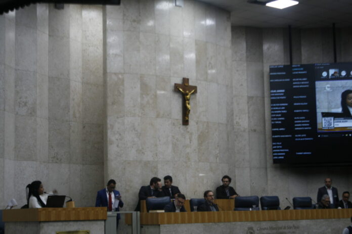 A sessão plenária da Câmara Municipal de São Paulo desta terça-feira (13) teve como um dos focos centrais o debate sobre a Favela do Moinho, única comunidade ainda existente na região central da capital paulista. A imagem registrada no momento da sessão mostra vereadores em articulação, enquanto o telão exibe uma imagem aérea da área urbana, indicando que projetos de intervenção e requalificação na região estavam em pauta.