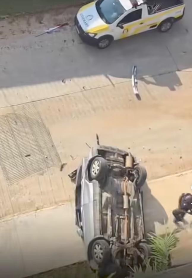 A imagem analisada revela um cenário de forte impacto: o veículo encontra-se completamente capotado, com a parte inferior exposta, evidenciando a violência da queda. Peças espalhadas pela via indicam que o carro sofreu danos severos durante o impacto.