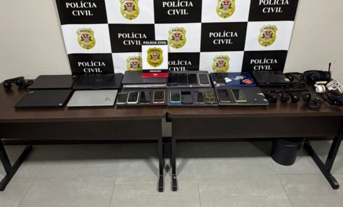 No local, foram apreendidos notebooks, celulares, acessórios eletrônicos e três veículos. Todo o material foi encaminhado para perícia.