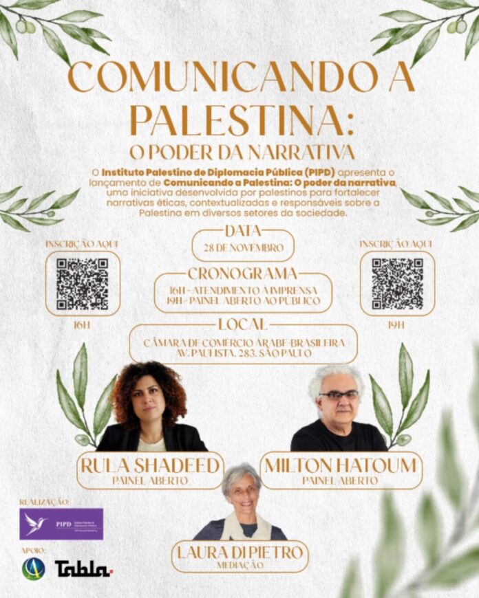 O Instituto Palestino de Diplomacia Pública (PIPD) realiza nesta quinta-feira, 28 de novembro, em São Paulo, o lançamento da iniciativa “Comunicando a Palestina: O Poder da Narrativa”, um projeto desenvolvido por comunicadores palestinos com o objetivo de fortalecer discursos éticos, contextualizados e responsáveis sobre a Palestina nos diferentes setores da sociedade brasileira.