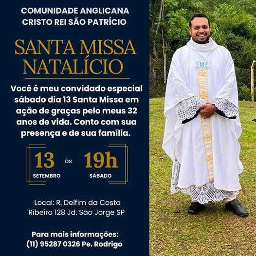 No próximo sábado, 13 /09/ 2025, a Comunidade Anglicana Cristo Rei São Patrício, localizada no Jardim São Jorge, em São Paulo, realizará uma celebração especial: a Santa Missa Natalícia em ação de graças pelo aniversário de 32 anos do Pe. Rodrigo.