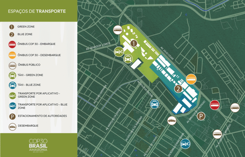 O material detalha todas as opções de deslocamento para as áreas Blue Zone (destinada a delegados e participantes credenciados) e Green Zone (aberta ao público e às iniciativas da sociedade civil), reforçando que a mobilidade sustentável é prioritária. São destacadas 15 linhas exclusivas de ônibus da COP30, que funcionarão 24 horas por dia, conectando a capital e municípios da Região Metropolitana de Belém, como Ananindeua, Marituba, Castanhal, Benevides, Icoaraci, Outeiro e Mosqueiro.