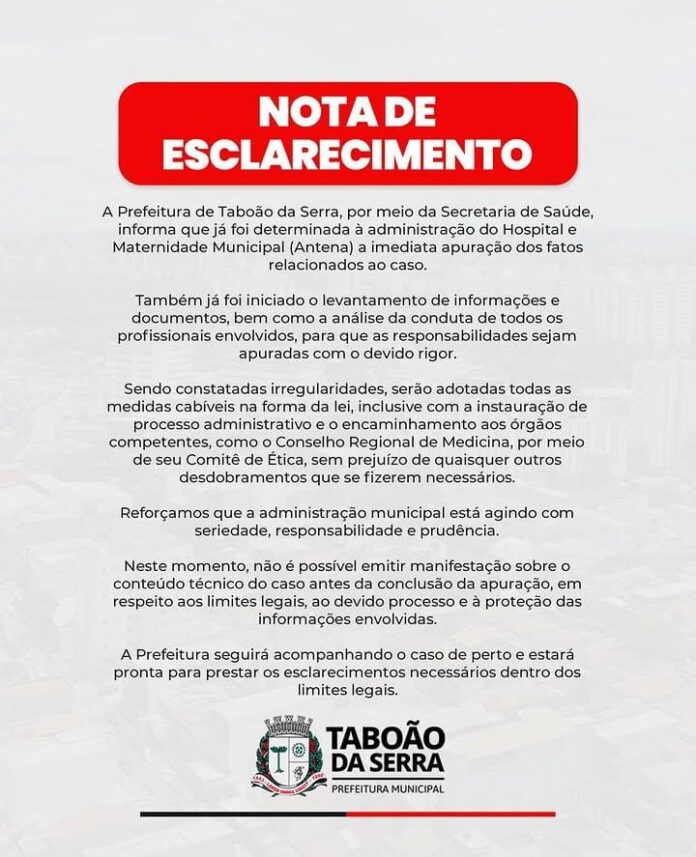 Segundo a nota, a Secretaria Municipal de Saúde determinou a coleta de documentos, informações e análise da conduta de todos os profissionais envolvidos. O texto reforça que, caso sejam constatadas irregularidades, medidas legais serão adotadas, incluindo processos administrativos e eventual encaminhamento ao Conselho Regional de Medicina.