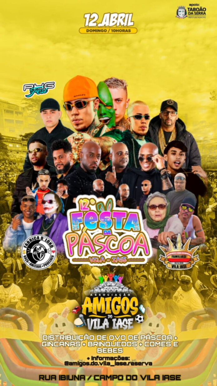 A 12ª Festa da Páscoa da Vila Iase, marcada para o próximo domingo (12 de abril), a partir das 10h, em Taboão da Serra, consolida-se como um dos maiores eventos comunitários da região. Organizada pela Associação Amigos do Vila Iase, com apoio da Prefeitura, a iniciativa une ação social, lazer e cultura periférica em um único espaço: a Rua Ibiúna, no Campo do Vila Iase.