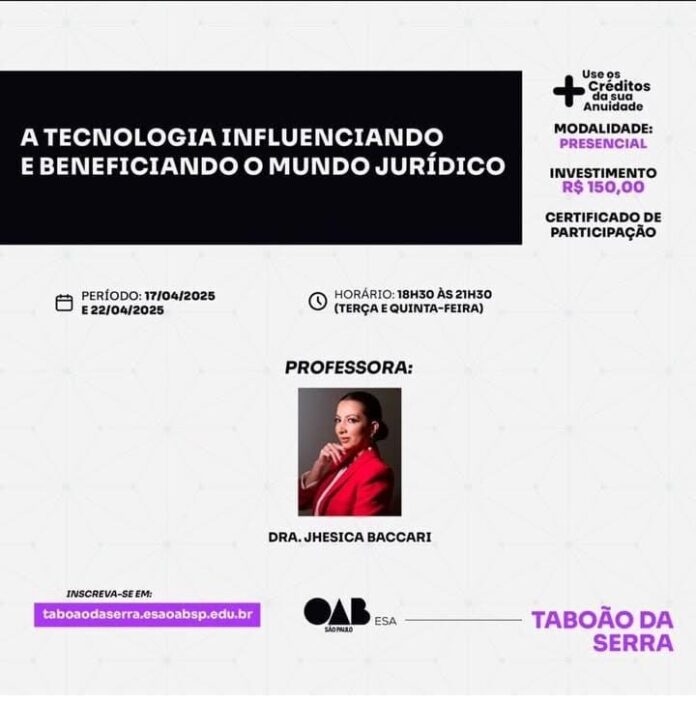 Com aulas conduzidas pela renomada Dra. Jhesica Baccari, a iniciativa tem como objetivo mostrar como a tecnologia está transformando o exercício da advocacia, o acesso à justiça e a atuação de profissionais do Direito em tempos de transformação digital acelerada.