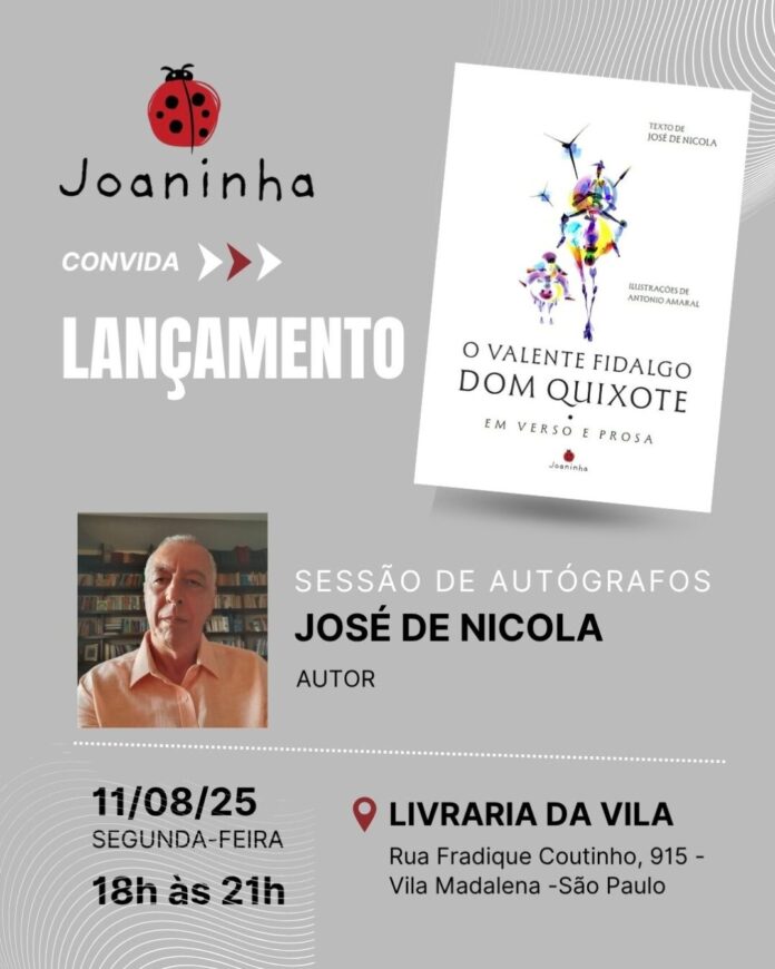 Um dos maiores clássicos da literatura ocidental, Dom Quixote de La Mancha, de Miguel de Cervantes, ganha nova vida nas mãos do autor José De Nicola. Com ilustrações de Antônio Amaral, o livro O valente fidalgo Dom Quixote – em verso e prosa, lançamento da Editora Joaninha, apresenta uma adaptação poética e acessível da célebre narrativa escrita há mais de quatro séculos. Voltado especialmente para o público jovem, o título convida também leitores adultos a redescobrir, de forma renovada e cativante, a essência do cavaleiro sonhador que luta contra moinhos de vento. Lançamento será nesta segunda, 11/08, às 18 hs, na Livraria da Vila, em São Paulo.