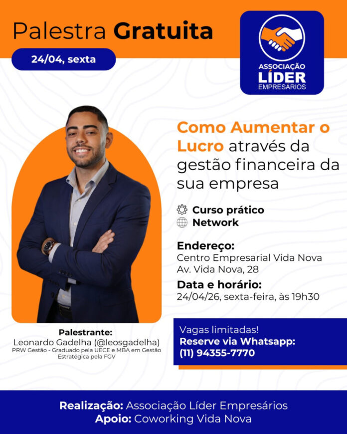No próximo dia 24 de abril, às 19h30, a Associação Líder Empresários promove uma palestra gratuita voltada a empreendedores que buscam aprimorar a gestão financeira e ampliar a lucratividade de seus negócios. O encontro será realizado no Centro Empresarial Vida Nova, localizado na Avenida Vida Nova, 28.