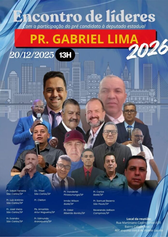 No próximo dia 20 de dezembro de 2025, às 13h, ocorrerá em São Carlos (SP) um importante Encontro de Líderes, reunindo pastores, diáconos e representantes de diversas cidades do interior paulista. O evento contará com a presença especial do Pr. Gabriel Lima, que se apresenta como futuro pré-candidato a deputado estadual pelo PDT para as eleições de 2026.