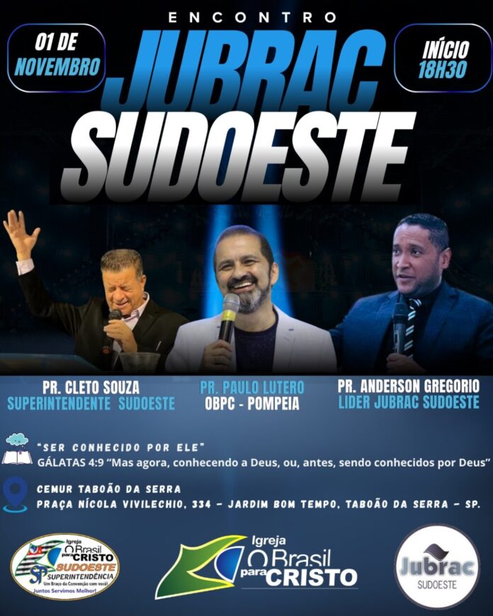 Na noite desta Sabado, 1º de novembro de 2025, o CEMUR de Taboão da Serra será palco de um grande momento de fé, louvor e comunhão com a realização do Encontro Jubrac Sudoeste — um dos principais eventos da juventude da Igreja O Brasil para Cristo na região.