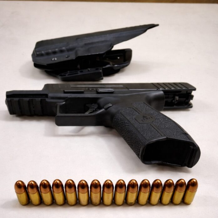 Durante a abordagem e revista no veículo, a equipe da GCM localizou uma pistola calibre 9 mm municiada, acompanhada de munições. A arma estava pronta para uso.