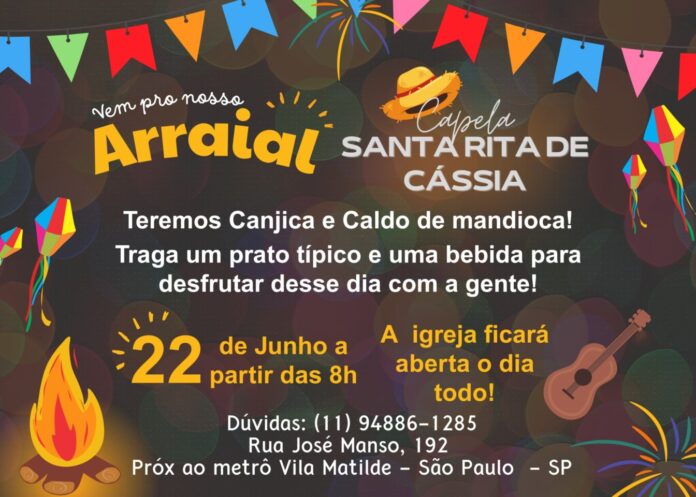 No próximo Domingo, 22/06/ 2025, a comunidade da Capela Santa Rita de Cássia prepara-se para viver um dia de fé, cultura popular e integração comunitária com a realização de seu tradicional Arraial Junino, a partir das 8h da manhã, na Rua José Manso, 192, próximo ao metrô Vila Matilde, em São Paulo (SP).