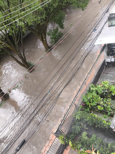 A fotografia mostra a água avançando com força ao longo da via, alcançando árvores, muros e calçadas. Um dos pontos mais alarmantes é a fiação elétrica baixa e exposta, aumentando o risco de acidentes graves, inclusive choques elétricos. O cenário reforça a sensação de vulnerabilidade vivida pelos moradores durante os temporais.