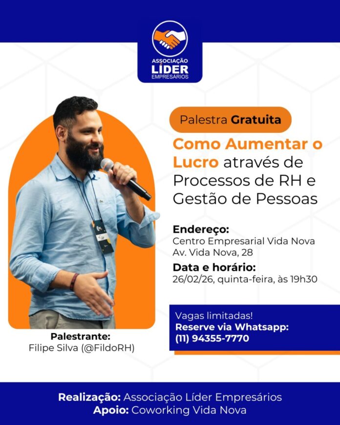 A Associação Líder Empresários promove no próximo dia 26 de fevereiro de 2026 (quinta-feira), às 19h30, uma palestra gratuita que promete movimentar o meio empresarial local. O tema, direto e estratégico, não passa despercebido: “Como Aumentar o Lucro através de Processos de RH e Gestão de Pessoas”.