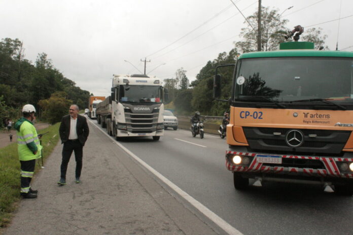 Na imagem, vê-se um agente da concessionária Arteris Régis Bittencourt em conversa com um homem de terno — identificado como Chefe de Gabinete do Deputado Federal Rui Falcão, que se encontrava em agenda oficial na região oeste e acabou retido no congestionamento provocado pela interdição.