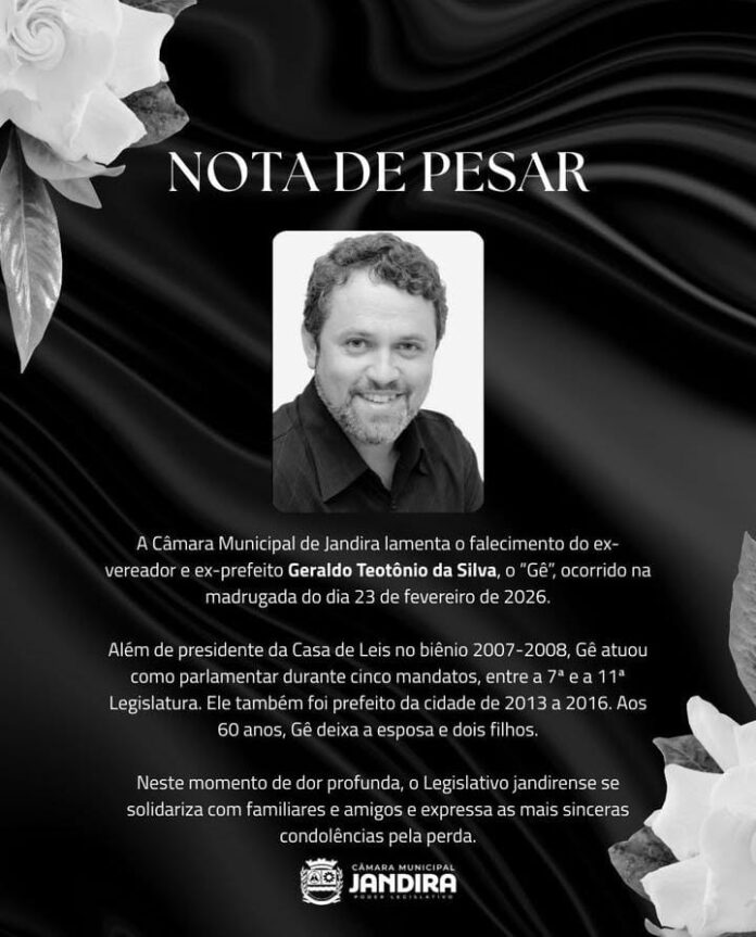 A política da Região Oeste da Grande São Paulo amanheceu em silêncio nesta segunda-feira (23). A Câmara Municipal de Jandira divulgou nota oficial comunicando o falecimento do ex-vereador e ex-prefeito Geraldo Teotônio da Silva, conhecido popularmente como “Gê”, aos 60 anos.
