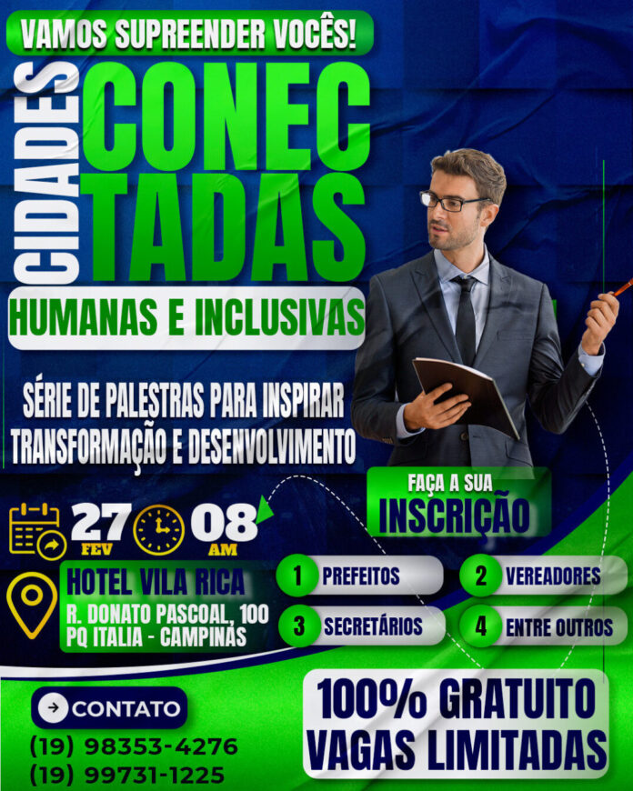 Campinas entra no radar do debate nacional sobre desenvolvimento econômico e políticas públicas no próximo dia 27 de fevereiro, às 8h, o Hotel Vila Rica, no Parque Itália, será palco do encontro “Cidades Conectadas, Humanas e Inclusivas”, uma série de palestras que promete reunir prefeitos, vereadores, secretários e lideranças regionais.