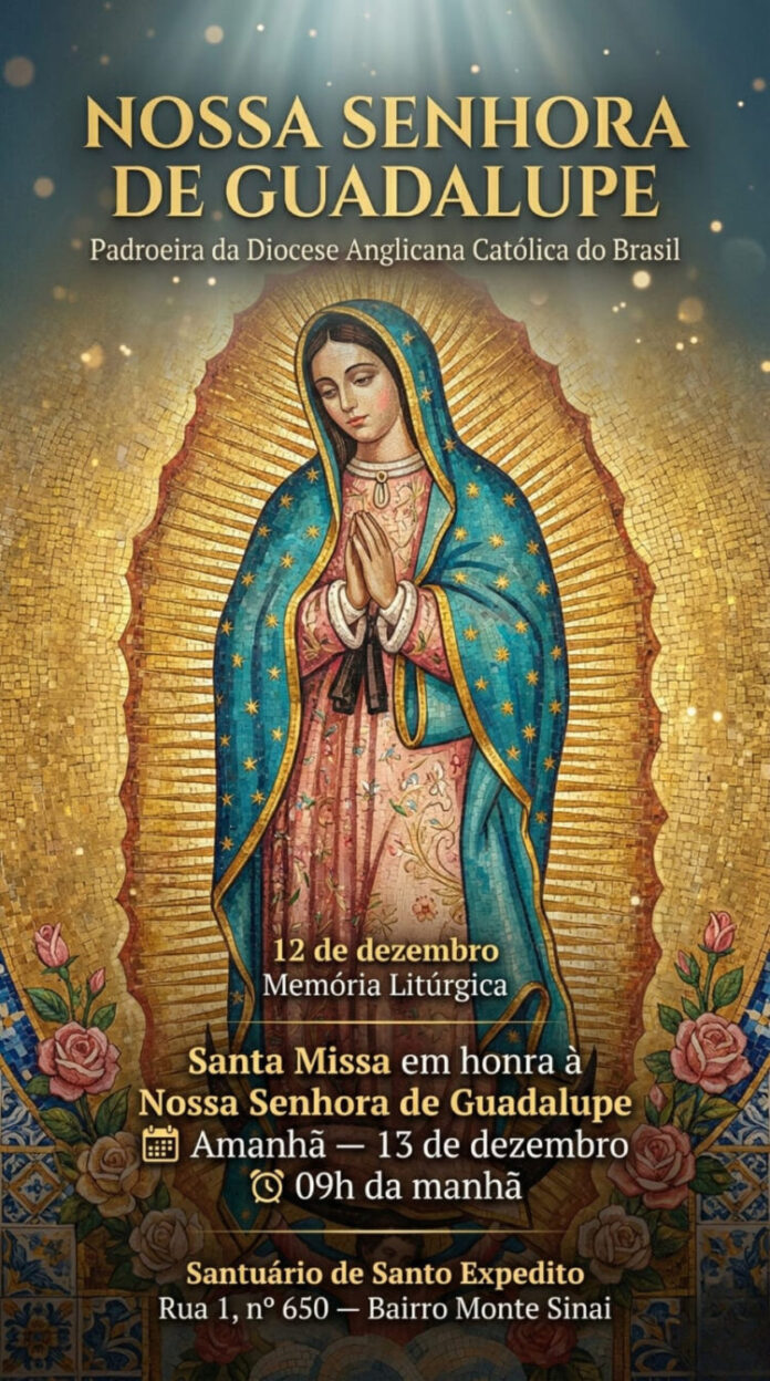 Desde 2004, sob o seu olhar sereno e firme, a Diocese caminha. Erra, aprende, cresce, evangeliza e resiste. Como toda obra que nasce de Deus, não é perfeita — mas é viva. E Guadalupe permanece ali, como Mãe, intercessora e sinal de que a fé latino-americana não é frágil: é resiliente, é profunda, é santa.Nossa Senhora de Guadalupe, Padroeira da América Latina e Padroeira da Diocese Anglicana Católica do Brasil, segue nos lembrando, dia após dia, que Deus escolheu habitar no meio do seu povo. E isso muda tudo.