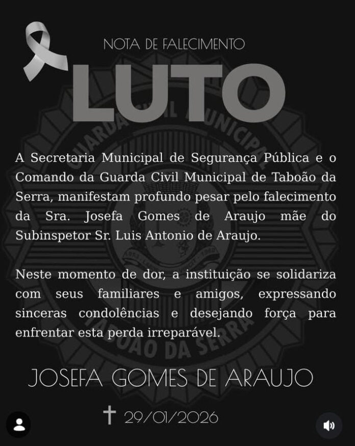 A cidade de Taboão da Serra amanheceu em luto nesta semana após a divulgação da nota oficial de falecimento da Sra. Josefa Gomes de Araújo, ocorrido em 29 de janeiro de 2026. A homenagem póstuma foi publicada pela Secretaria Municipal de Segurança Pública e pelo Comando da Guarda Civil Municipal (GCM), manifestando profundo pesar pela perda da mãe do Subinspetor da GCM, Sr. Luís Antônio de Araújo.