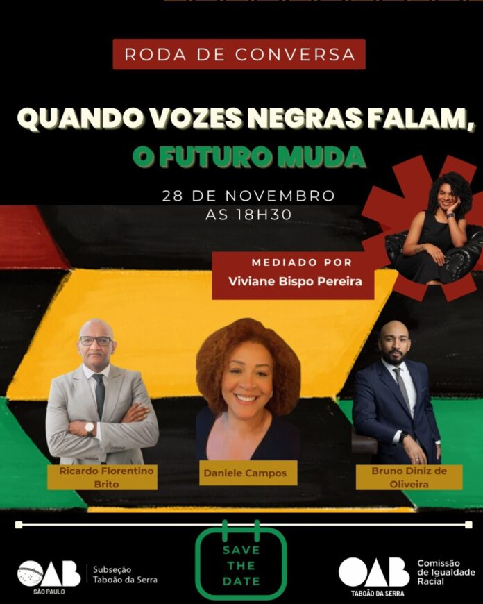 A OAB Taboão da Serra, por meio da Comissão de Igualdade Racial, realizará no dia 28 de novembro, às 18h30, a roda de conversa “Quando Vozes Negras Falam, o Futuro Muda”, um encontro dedicado à valorização das narrativas negras e ao fortalecimento do debate sobre equidade racial no âmbito jurídico e social.