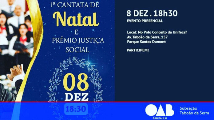 A Ordem dos Advogados do Brasil – Subseção Taboão da Serra promove, nesta segunda-feira, 8 de dezembro, às 18h30, um evento inédito que reúne música, celebração comunitária e reconhecimento público: a 1ª Cantata de Natal e a entrega do Prêmio Justiça Social. A programação acontece no Polo Conceito da Unifecaf, localizado na Av. Taboão da Serra, 157 – Parque Santos Dumont.