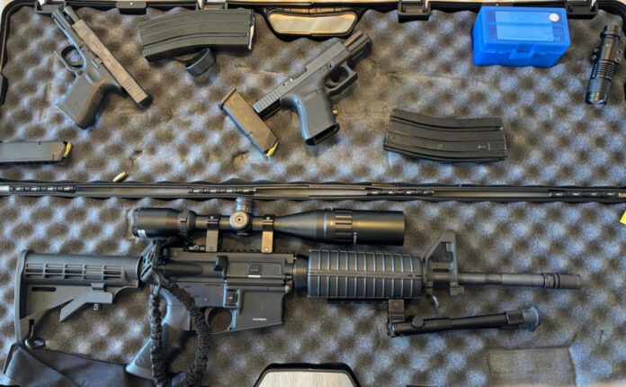 No endereço foram apreendidas duas pistolas Glock semiautomáticas, calibres .380 e .40, além de um fuzil Taurus calibre 5,56 e diversas munições.