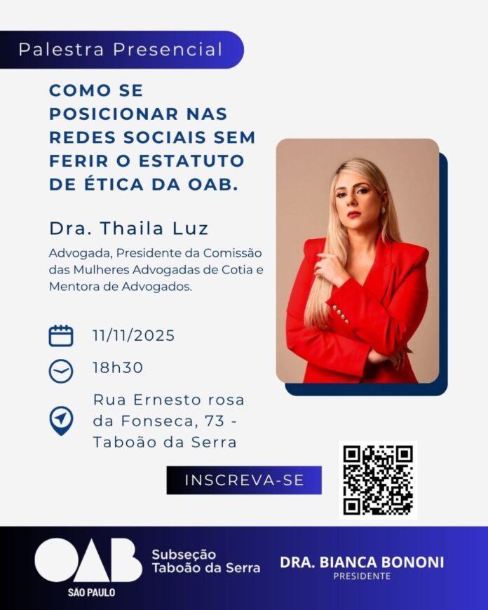 Com esse propósito, a OAB Subseção Taboão da Serra, presidida pela Dra. Bianca Bononi, promove nesta terça-feira, 11 de novembro, às 18h30, a palestra presencial “Como se Posicionar nas Redes Sociais sem Ferir o Estatuto de Ética da OAB”, ministrada pela Dra. Thaila Luz, advogada, mentora de advogados e presidente da Comissão das Mulheres Advogadas de Cotia.