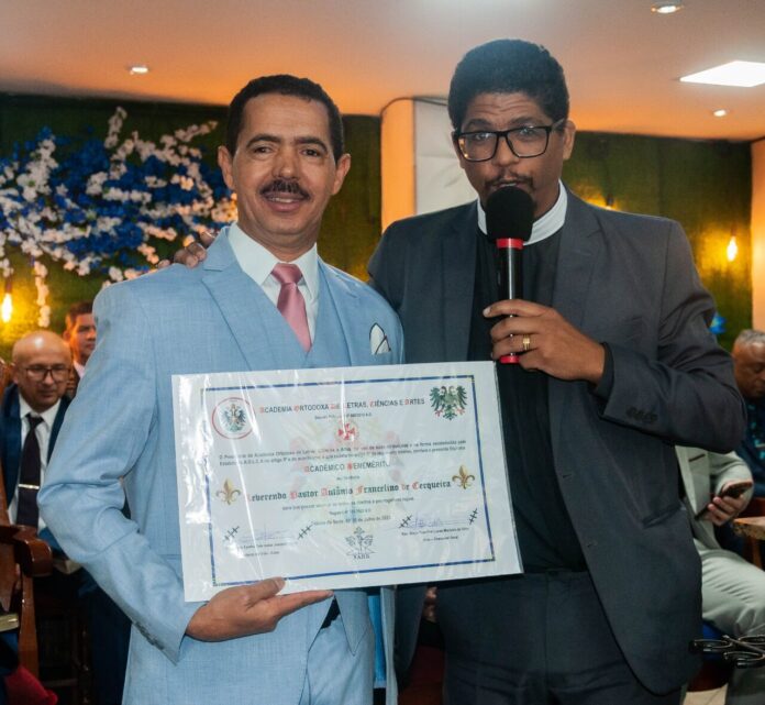 O ponto alto da cerimônia foi a entrega oficial do título de Acadêmico Benemérito pela AOLCA – Academia Ortodoxa de Letras, Ciências e Artes, outorgado pelas mãos do Reverendo Bispo Isaias Dutra, presidente da instituição. A honraria reconhece a relevante trajetória espiritual, pastoral e comunitária do Pastor Cerqueira, que ao longo de sua vida tem exercido com excelência a liderança cristã e a promoção de valores que transcendem os muros da igreja.