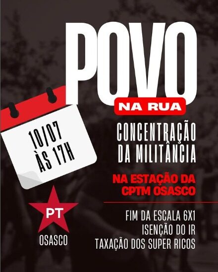 A militância do Partido dos Trabalhadores da Macro Região de Osasco está convocando a população para um importante ato público que acontecerá nesta quarta-feira, dia 10 de julho, com concentração marcada para as 17h na Estação da CPTM de Osasco. O evento integra uma série de mobilizações que também ganharão as ruas da Avenida Paulista ao longo da manhã e tarde, em defesa dos direitos da classe trabalhadora e por justiça fiscal.