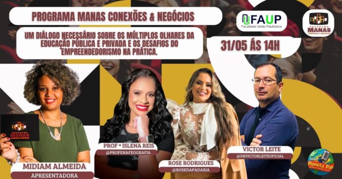 No Proximo sábado, 31 de maio, a partir das 14h, a Faculdade União Paulistana (FAUP), em Santo Amaro, será palco de mais uma edição do Programa Manas – Conexões & Negócios. Com produção da Multipotencial Artes e da Rádio Planeta Pan, o evento promove o encontro entre educadores e empreendedores, fortalecendo redes de apoio, colaboração e transformação social.