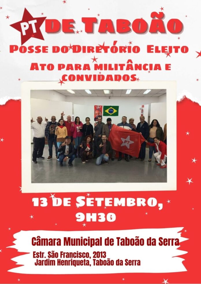 No próximo sábado, 13/09/ 2025, às 9h30, a Câmara Municipal de Taboão da Serra será palco de um ato político que marca um novo capítulo na história do Partido dos Trabalhadores (PT) no município. Trata-se da posse oficial do diretório eleito, em cerimônia aberta à militância e convidados.