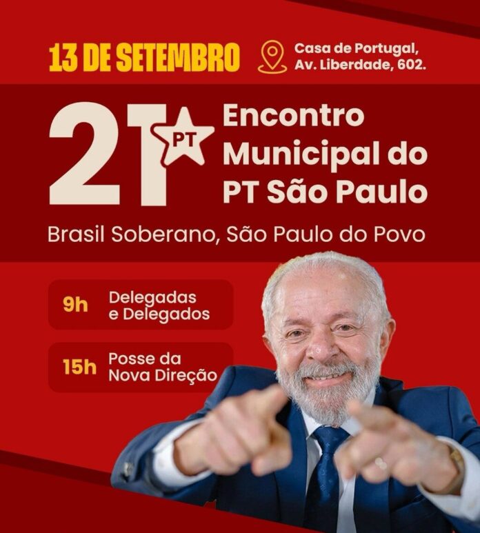 No próximo 13/09/ 2025, o Partido dos Trabalhadores de São Paulo (PT-SP) promove o seu 21º Encontro Municipal, que acontecerá na tradicional Casa de Portugal, localizada na Avenida Liberdade, 602.