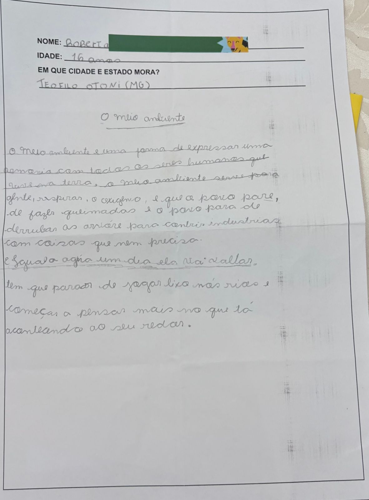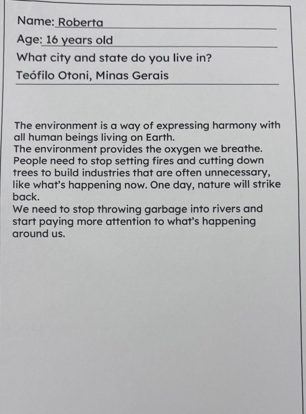 “O meio ambiente é uma forma de expressar uma harmonia com todos os seres humanos que vivem na terra”, afirma Roberta, 16 anos, de Minas Gerais. “Eu não quero que haja desmatamento. Eu não quero que haja poluição”, cobra Pedro, 9 anos, de Minas Gerais. “O Brasil é um dos países mais vulneráveis frente à mudança do clima, a tendência é entrar em completo colapso. Amar é conservar”, alertou Gustavo, 16 anos, do Pará. “Nesta COP 30, espero que seja discutido sobre mudanças no comportamento das pessoas, sensibilização ao aquecimento global para gerar um mundo melhor”, escreve Valentina, 14 anos, do Pará.