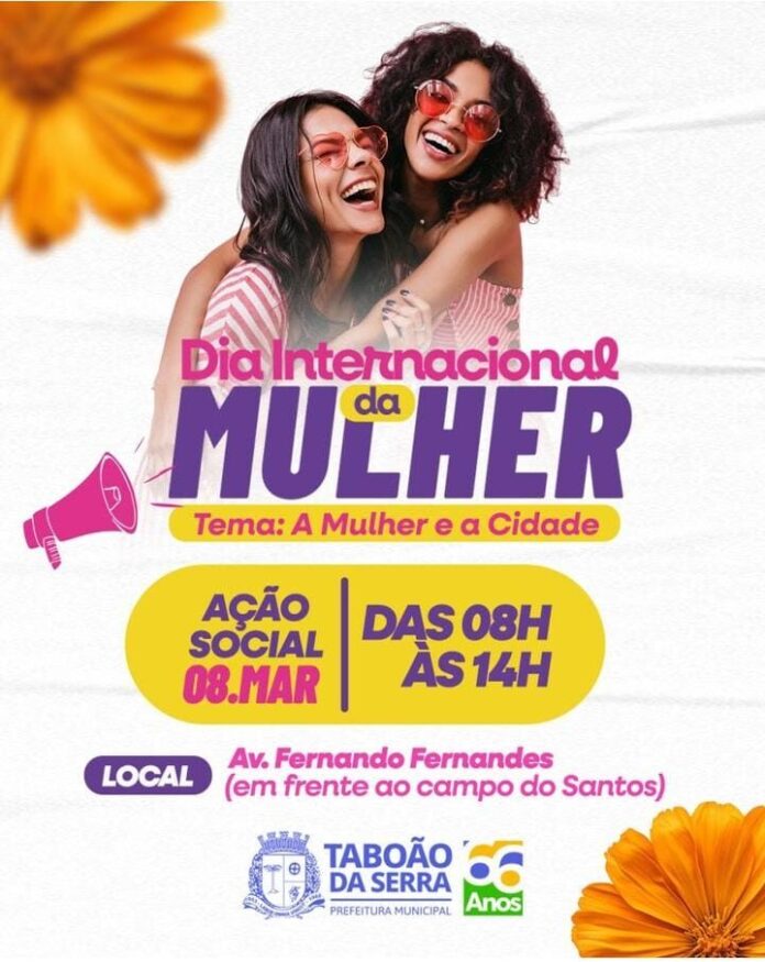 A Secretaria da Mulher, Direitos Humanos e Cidadania (SMDHCM) de Taboão da Serra, convida a população para celebrar o Mês das Mulheres com a ação social “A Mulher e a Cidade“, que acontecerá neste sábado, dia 8 de março, na Avenida Fernando Fernandes, das 8h às 14h.