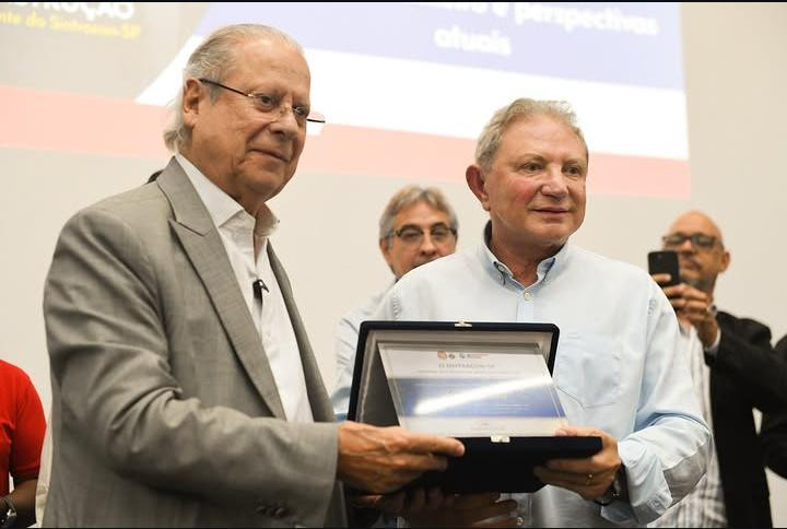 No palco, Dirceu aparece sendo homenageado com uma placa, em um gesto simbólico que reforça sua trajetória política e sua ligação histórica com movimentos sindicais e trabalhistas. O clima é de respeito, mas também de expectativa: não se trata apenas de ouvir, mas de compreender os próximos passos de um país em constante tensão política.