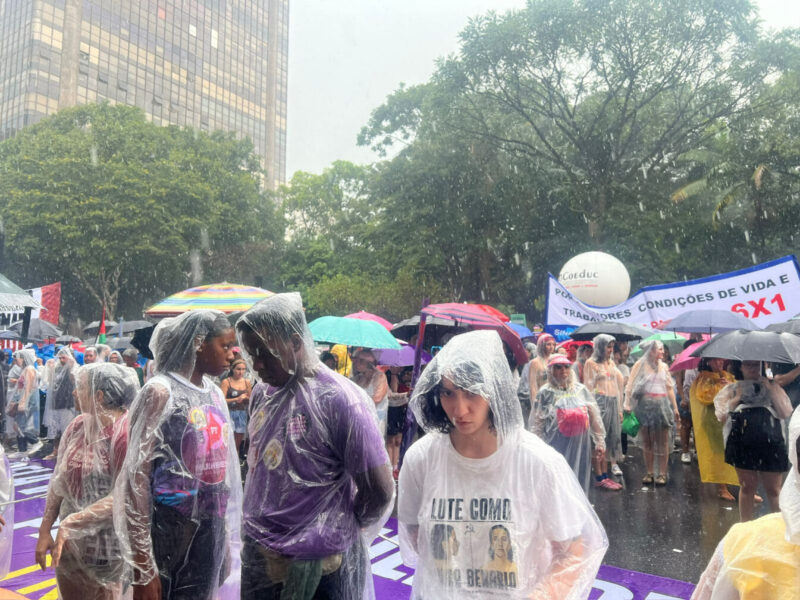 Vestidas com capas plásticas improvisadas, empunhando guarda-chuvas e faixas de protesto, manifestantes marcharam sob o lema “Pela Vida das Mulheres”, denunciando a escalada da violência de gênero no país e cobrando ações mais efetivas do Estado brasileiro no enfrentamento ao feminicídio.