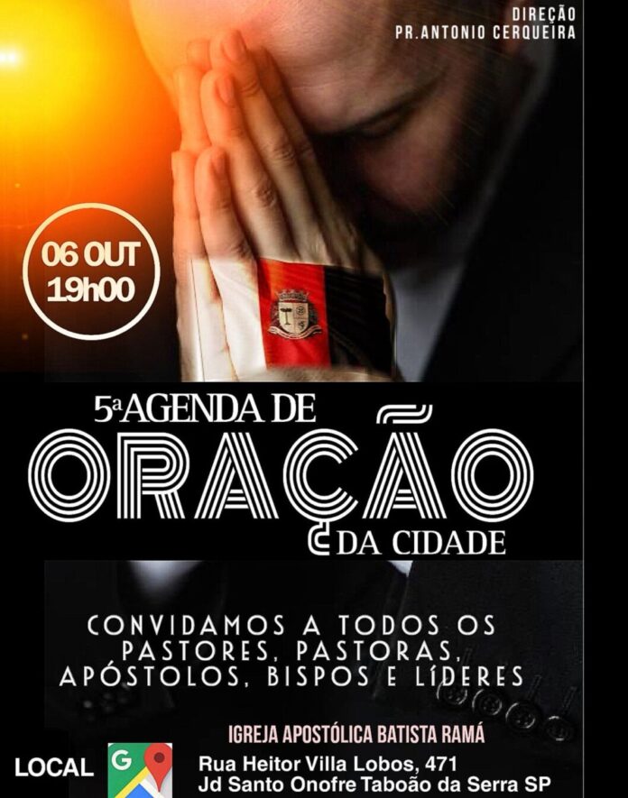 No próximo dia 6/10/2025 , às 19h, a cidade de Taboão da Serra será palco de mais um importante momento de fé e união espiritual: a 5ª Agenda de Oração da Cidade. O encontro, que acontecerá na Igreja Apostólica Batista Ramá, localizada na Rua Heitor Villa Lobos, 471 – Jardim Santo Onofre, tem a direção do Pastor Antonio Cerqueira ea Cobertura da Gazzeta Paulista.