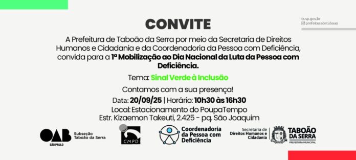 A Prefeitura de Taboão da Serra, por meio da Secretaria de Direitos Humanos e Cidadania e da Coordenadoria da Pessoa com Deficiência, promove no próximo dia 20 de setembro de 2025 a 1ª Mobilização ao Dia Nacional da Luta da Pessoa com Deficiência, com o tema “Sinal Verde à Inclusão”.