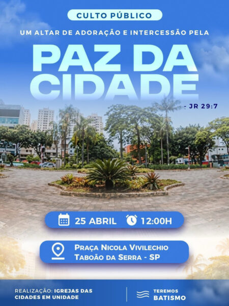 Neste, Sábado 25/04/ 2026, a Praça Nicola Vivilechio se transforma em palco de um grande encontro religioso ao ar livre. O evento, intitulado “Culto Público – Paz da Cidade”, reúne igrejas sob o movimento “Cidades em Unidade”, com início previsto para às 12h.