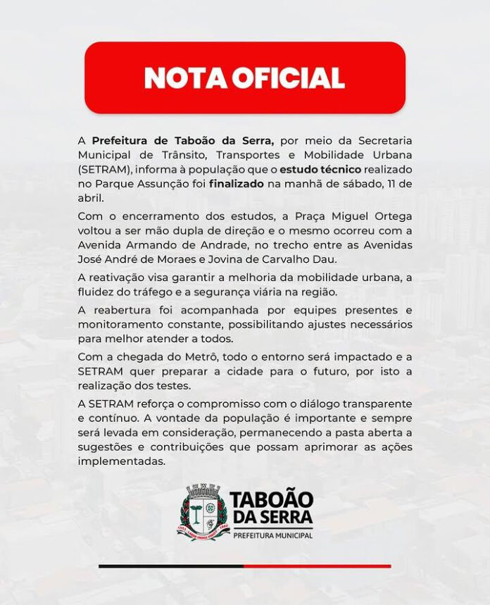 Segundo a administração municipal, os testes realizados no entorno do Parque Assunção foram finalizados na manhã de sábado, 11/04/2026. Como resultado, a Praça Miguel Ortega voltou a operar em mão dupla, mudança que também foi aplicada à Avenida Armando de Andrade, no trecho entre as avenidas José André de Moraes e Iovina de Carvalho Dau.