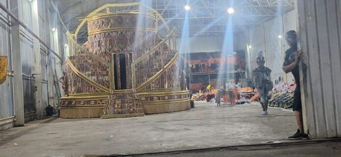 O carro alegórico visto nas imagens, com detalhes dourados e padronagens geométricas, remete às tradições angolanas, enquanto as fantasias exaltam elementos como as penas coloridas, máscaras e tecidos típicos .